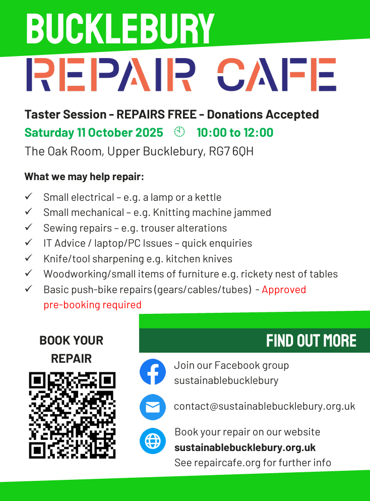Sustainable Bucklebury will be holding our first Repair Cafe on 11 October 2025.